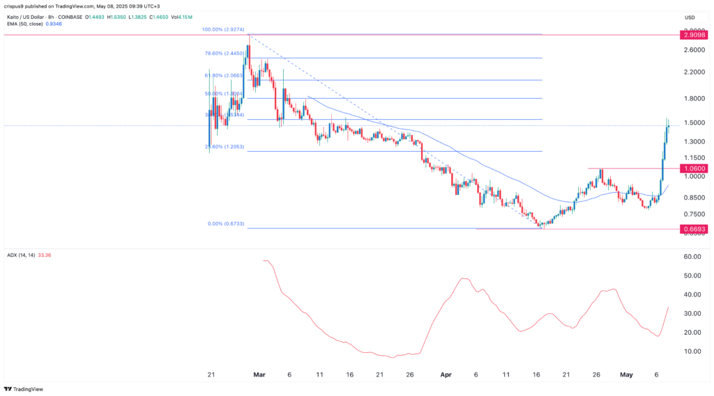 تظهر الشمعة لمدة ثماني ساعات أن سعر Kaito قد ارتد وانتقل فوق مستوى المقاومة المهم عند $1.0600، وهو أعلى نقطة في 26 أبريل. لقد ألغى نمط القمة المزدوجة من خلال الانتقال فوق ذلك المستوى