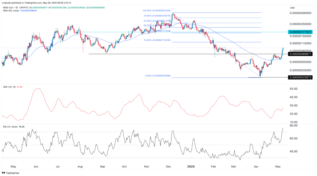 MOGسعر توكن Mog Coin بلغ أدنى مستوى له عند $0.0000002582 في أبريل ثم طفرة إلى ما يقرب من $0.000010. لقد قفز فوق مستوى المقاومة الحاسم عند $0.00000070، وهو أدنى مستوى في سبتمبر من العام الماضي