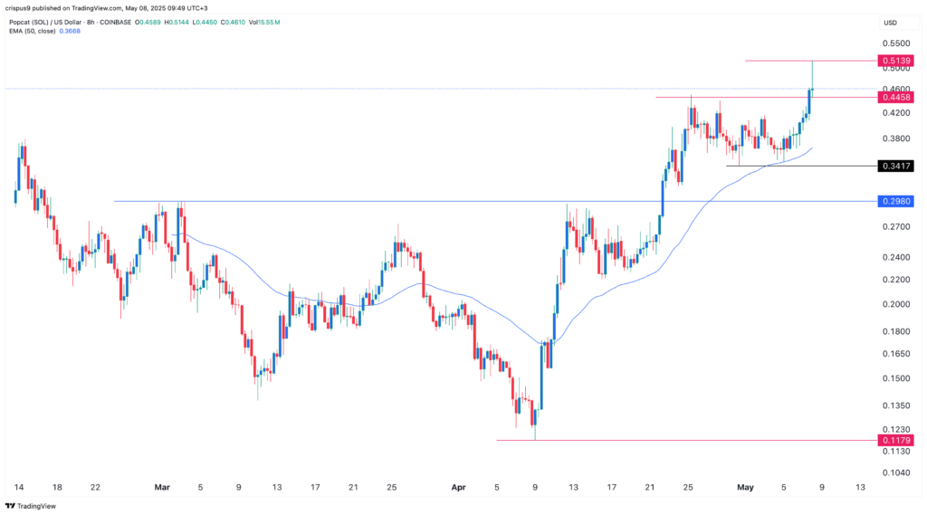 لذلك، من المحتمل أن يستمر سعر Popcat في الارتفاع حيث يستهدف المتداولون النقطة الرئيسية التالية للمقاومة عند 1 دولار، بزيادة قدرها 117% عن المستوى الحالي. ستلغي الحركة التي تقل عن الدعم عند 0.3417 دولار توقعات Popcat الصعودية.