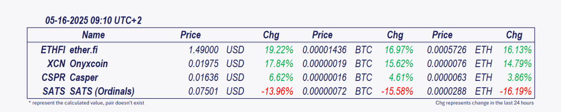 - كاسبر حقق أكبر مكاسب خلال اليوم منذ منتصف الليل، حيث ارتفع بنسبة 11.41%.