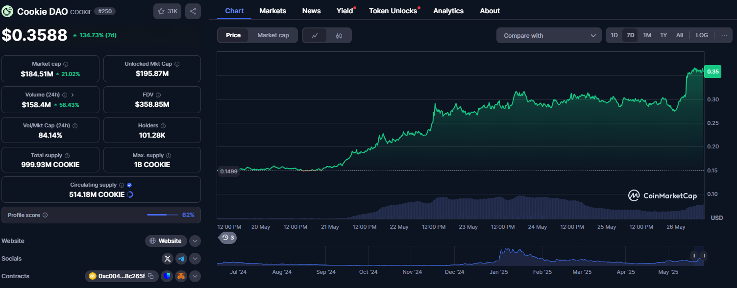 لقد كان قطاع الذكاء الاصطناعي في سوق العملات الرقمية هو الأسرع نموًا في السنوات الأخيرة ومن المتوقع أن يصل إلى 826 مليار دولار بحلول عام 2030. لقد انطلقت العديد من المشاريع الجديدة المدعومة بالذكاء الاصطناعي في الأشهر الأخيرة، حيث كان مشروع COOKIE هو المشروع الأحدث الذي انفجر قبل بضعة أيام فقط.