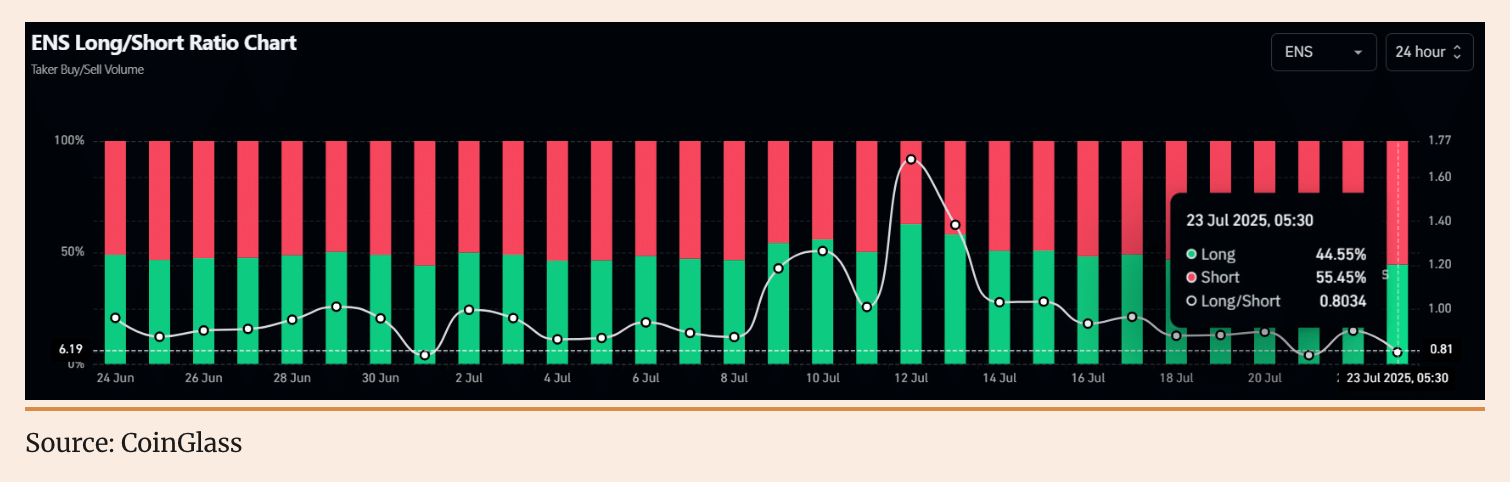 إذا استمر ENS في الهبوط، فهناك مساحة هبوط بنسبة 8%، وقد ينخفض السعر إلى مستوى $25.20. وقد عزز نشاط المتداولين الأخير هذه التوقعات الهبوطية. وفقًا لبيانات CoinGlass على السلسلة، فإن نسبة Long/Short لـ ENS هي 0.8034، مما يدل على مشاعر هبوطية قوية. في الوقت نفسه، يحتفظ 44.55% من كبار المتداولين بمراكز شراء صعودية، بينما يحمل 55.45% مراكز بيع هبوطية، مما يشير إلى أن البائعين يهيمنون على السوق.