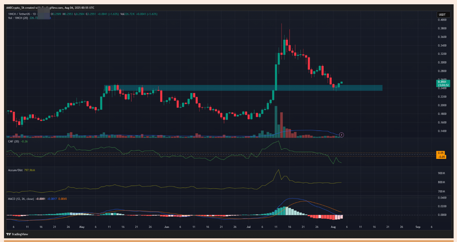سعر الانسحاب للخلف إلى منطقة الدعم المهمة من 13 يوليو إلى 2 أغسطس ، انخفض سعر 1INCH بأكثر من 40 ٪ ، لكنه لا يزال يحتفظ بهيكل صعودي على فترات زمنية عالية. عادت الأسعار حاليًا إلى منطقة $0.24 التي كانت مستوى مقاومة رئيسي في مايو ، وتم اختبارها مؤخرًا بنجاح كالدعم ، وهو إشارة إيجابية للمستثمرين على المدى الطويل ، أو قد يشكل فرصة للشراء عند المستويات المنخفضة.
