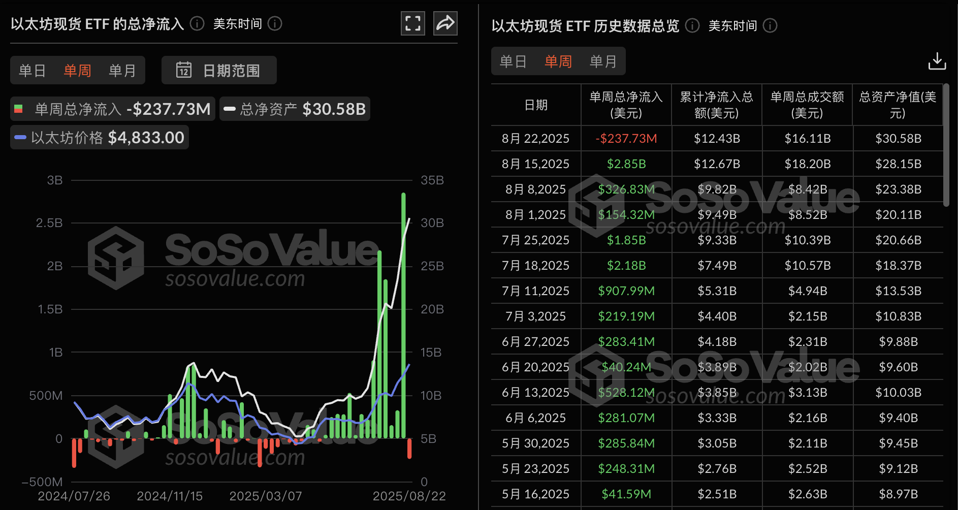 وفقًا لبيانات SoSoValue، شهدت صناديق الاستثمار المتداولة في إثيريوم تدفقًا خارجيًا صافياً قدره 238 مليون دولار أمريكي في الأسبوع الماضي ( من 18 أغسطس إلى 22 أغسطس )، منهية سلسلة من 14 أسبوعًا من التدفقات الداخلة الصافية.