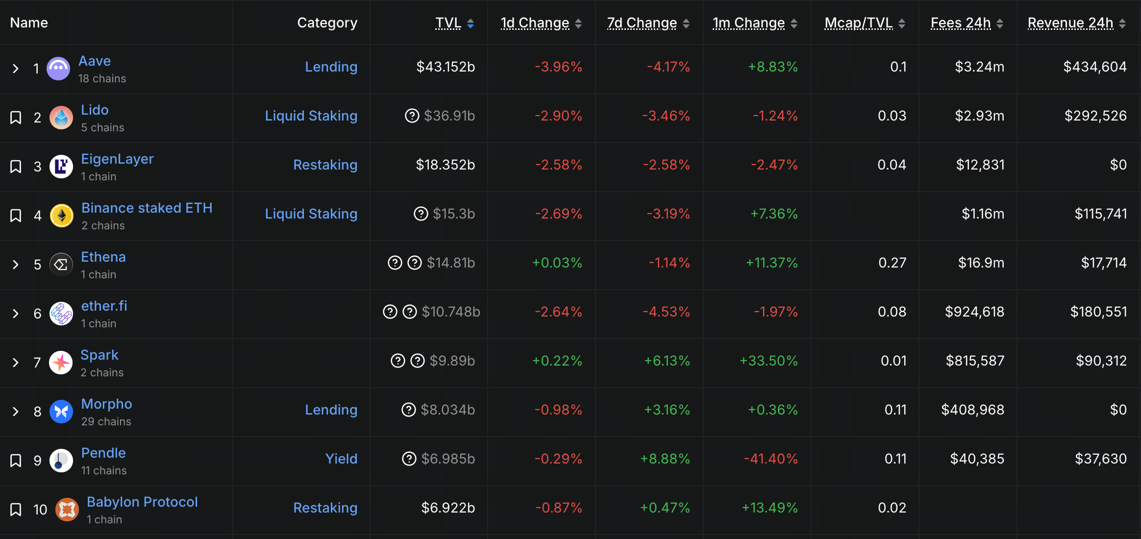 على الرغم من وجود أساس للانتعاش في السوق، لا يزال البيئة العامة ضعيفة. انخفض Aave بنسبة 4.17% في الأسبوع، وLido بنسبة 3.46%، وEigenLayer بنسبة 2.58%، وتأثرت العديد من بروتوكولات الإقراض والاقتراض.