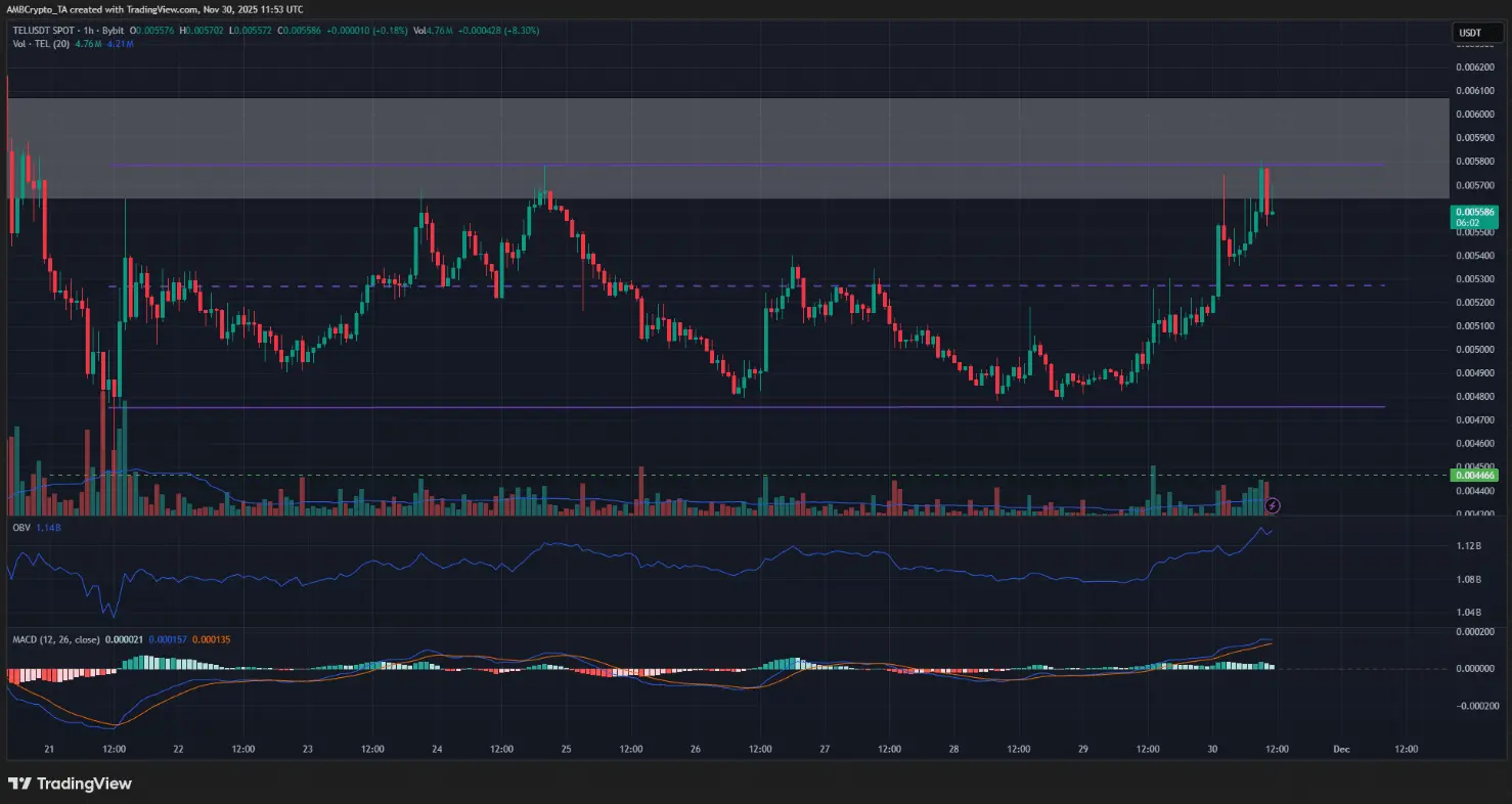 مخطط TEL/USDT ساعي | المصدر: TradingViewعلى المخطط الساعي، يتذبذب TEL ضمن نطاق 9 أيام (باللون الأرجواني) من 0.0047 إلى 0.0057 USD، مع نقطة المنتصف 0.0052 USD التي تعمل كدعم ومقاومة في الجلسات الأخيرة. ارتفع مؤشر OBV بشكل كبير خلال الـ 24 ساعة الماضية، بالتزامن مع إشارة صعودية من MACD، مما يدل على حجم شراء كبير مع زخم سعر صاعد.