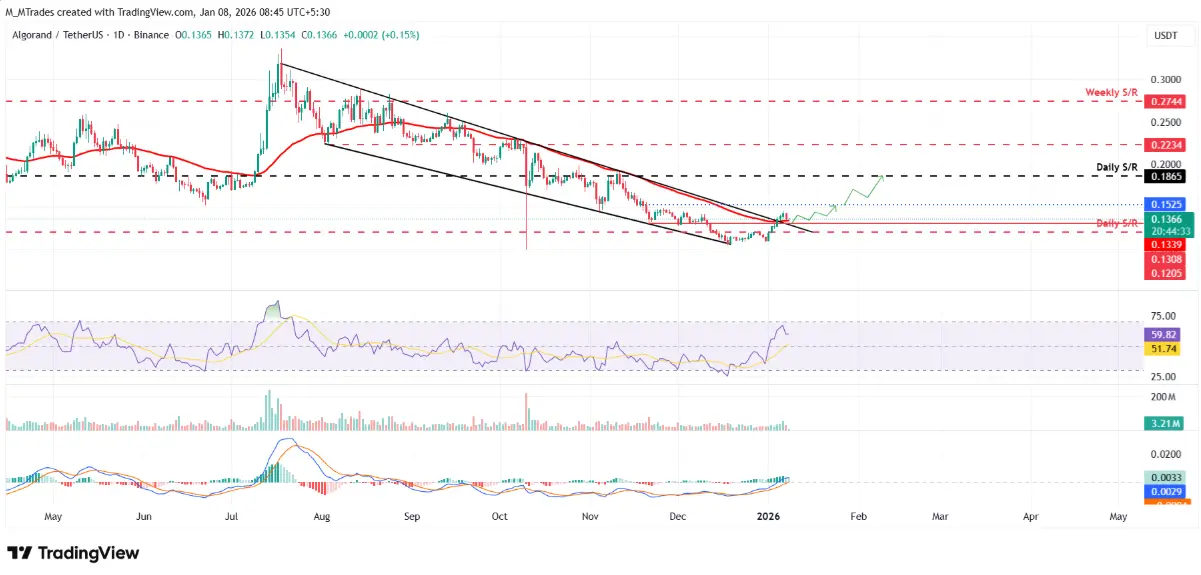 في سيناريو إيجابي، إذا استمر خط الاتجاه المذكور — الذي يتقاطع تقريبًا مع المتوسط المتحرك الأسي (EMA) لمدة 50 يوم عند 0,133 دولار — في الحفاظ على دعمه، فمن المرجح أن يستعيد ALGO زخم الارتفاع ويتجه نحو مستوى المقاومة اليومي عند 0,152 دولار. إغلاق ناجح فوق هذا المستوى قد يفتح المجال لمزيد من الارتفاعات، مع الهدف التالي عند مستوى المقاومة المهم عند 0,186 دولار.