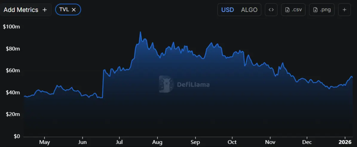 وفقًا لبيانات من DefiLlama، فإن القيمة الإجمالية المقفلة (TVL) لألجوراند استمرت في الارتفاع المستقر منذ منتصف ديسمبر، وتبلغ الآن حوالي 54.7 مليون دولار. هذا التطور يدل على عودة تدفقات رأس المال إلى نظام ألجوراند البيئي، مما يعكس تزايد اهتمام المستخدمين الذين يرسلون ويطلقون الأصول بنشاط على البروتوكولات المبنية على منصة ALGO.