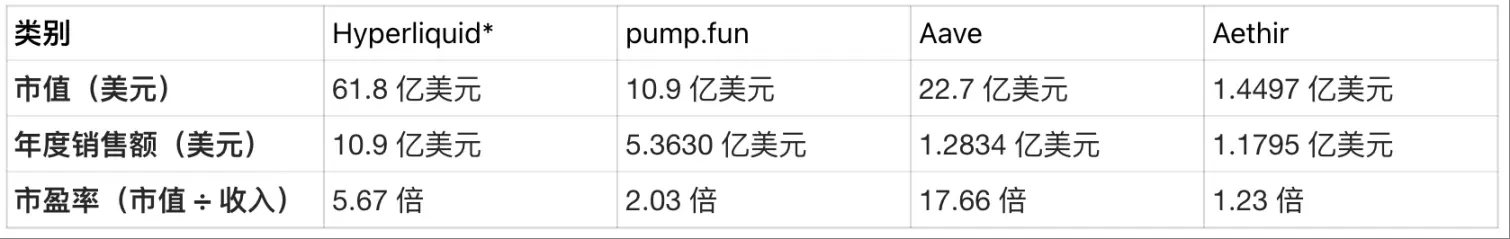 يمكننا تقييم قيمتها عبر نسبة السعر إلى الأرباح (PER) لمشاريع ربحية رئيسية مثل Hyperliquid و Pump.fun. يُحسب PER بقسمة القيمة السوقية على الإيرادات السنوية، ويعكس ما إذا كان تقييم المشروع معقولًا بالنسبة للإيرادات الفعلية.