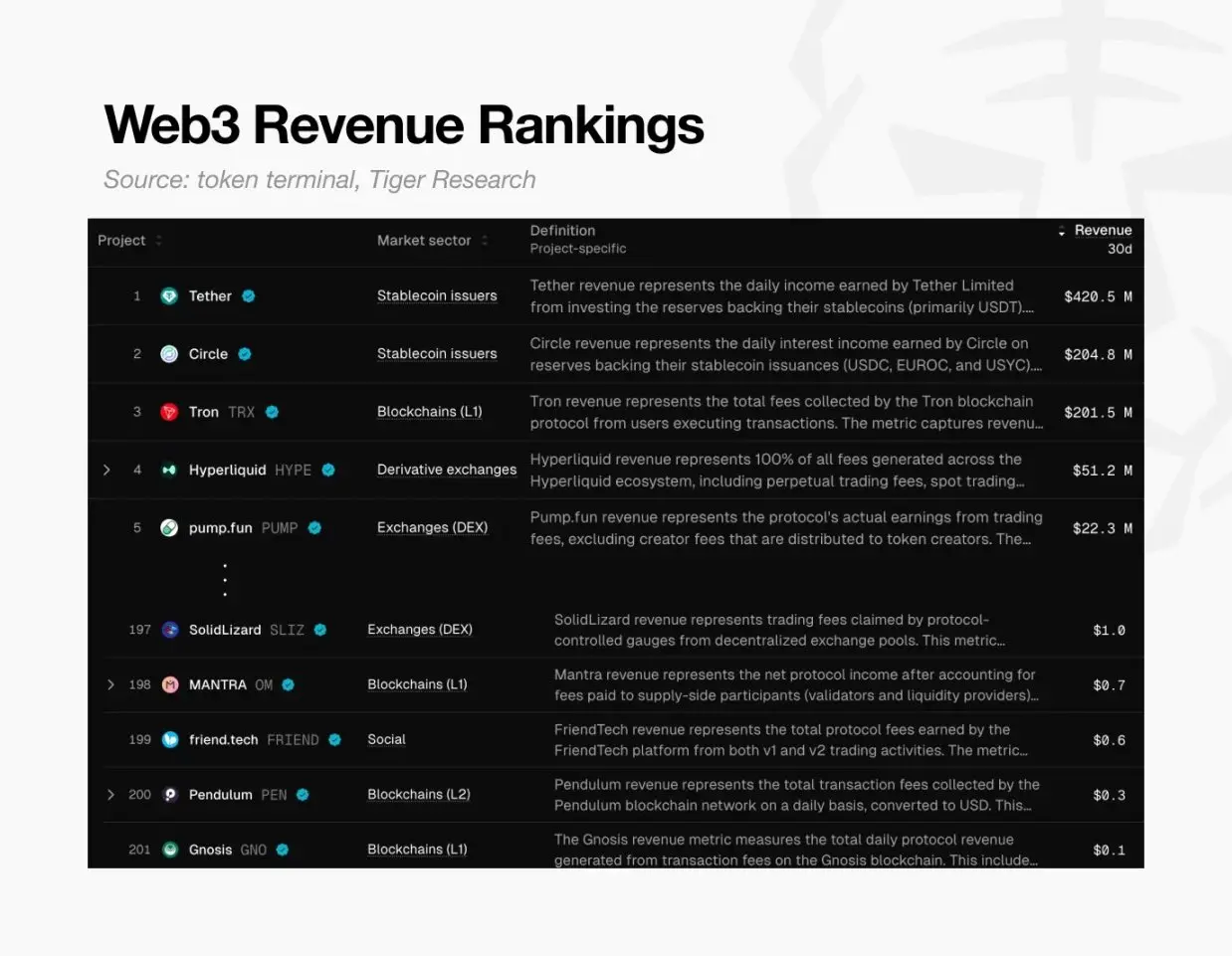 تصنيف إيرادات Web3، المصدر: token terminal و Tiger Research