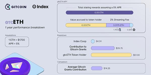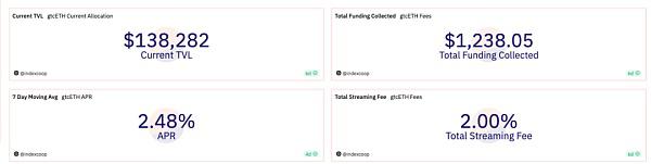 بالإضافة إلى ذلك ، دخلت Index Coop في شراكة مع Gitcoin لإطلاق gtcETH ، مما يسمح للمستخدمين بتمويل منح Gitcoin من خلال مكافآت Staking ETH ، مع فرض رسوم تدفق بنسبة 2٪ ، منها 1.75٪ تذهب إلى منح Gitcoin و 0.25٪ إلى Index Coop. في الوقت نفسه ، تمتلك IndexCoop أيضًا ICETH ، وهو منتج لاستراتيجية التعهد بالسيولة يعتمد على بروتوكول Set Protocol ، والذي يمكن أن يوفر عوائد أعلى من ETH. حاليًا ، تبلغ قيمة TVL لـ gtcETH 138،282 دولارًا أمريكيًا.
