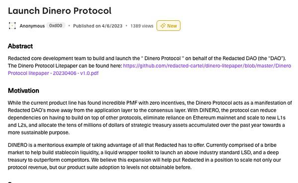 أعلنت اتفاقية الرشوة Redacted Cartel رسميًا في أبريل أنها أطلقت Dinero ، وهو بروتوكول ثابت للعملات مدعوم من Ethereum block space ، وهو مشتق يستخدم سوق مساحة الكتلة المتميزة من خلال إنشاء RPC عام وغير مصرح به ، جنبًا إلى جنب مع اتفاقية ETH الخاصة بالمنتج.