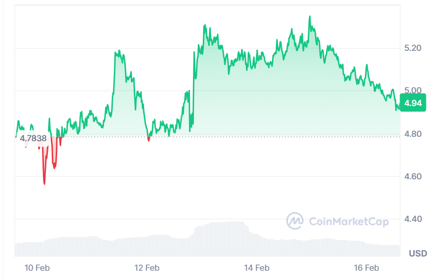 بالنسبة لأداء السوق، فإن سعر رمز DOT قد تراوح مؤخرًا بين 4.91 دولار إلى 5.12 دولار. ومع ذلك، لا يزال بولكادوت متخلفًا عن أعلى مستوى له على الإطلاق والبالغ 55.00 دولار في (نوفمبر 2021)