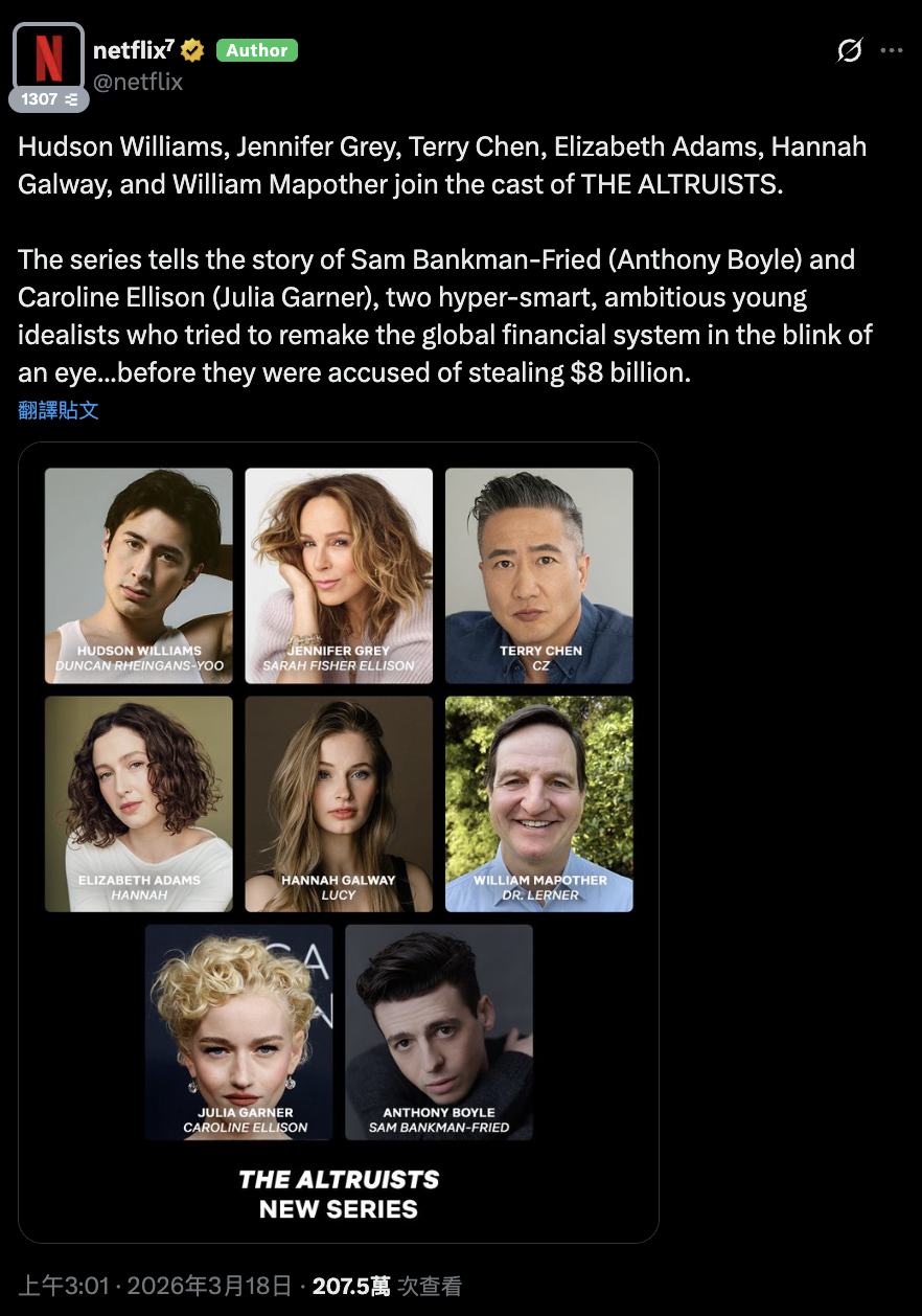 كشفت شركة نتفليكس، عملاق البث، رسميًا عن قائمة الممثلين للمسلسل الجديد “الأنانيون” (The Altruists)، المستند إلى حادثة انهيار بورصة العملات الرقمية FTX. ستتناول السلسلة المكونة من 8 حلقات، والتي تحظى بترقب كبير، أحد أكبر إخفاقات صناعة التشفير في التاريخ. كتب السيناريو وأشرف على الإنتاج الحائز على جائزة الأوسكار غراهام مور، ويشارك في الإنتاج شركة هاير جراوند التي أسسها زوجا أوباما السابقان.
