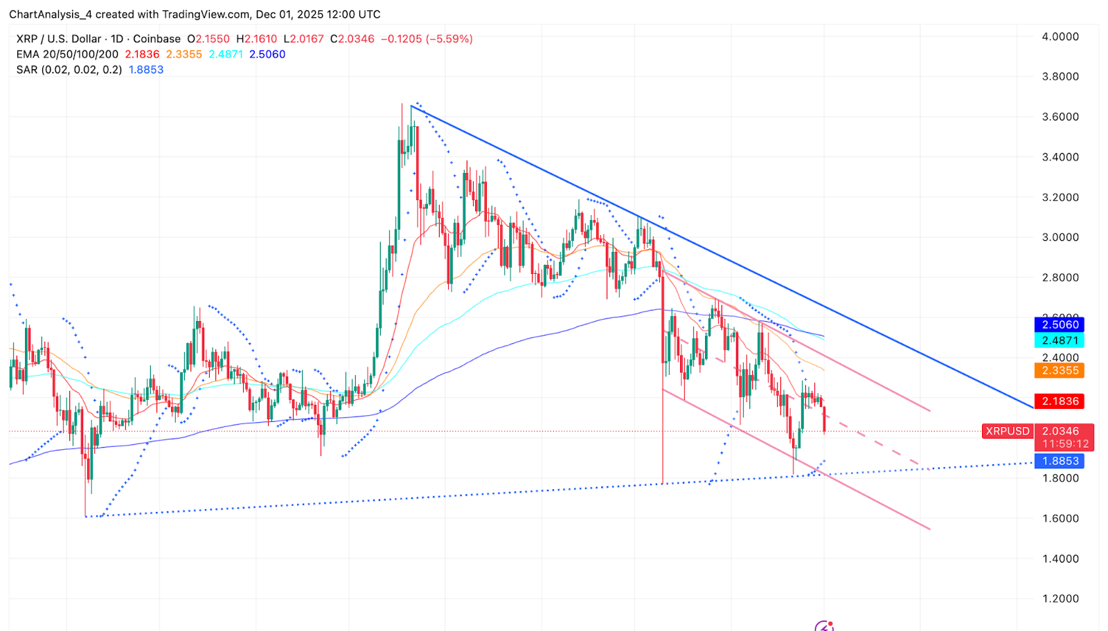 تظهر مؤشرات بارابوليك سار فوق السعر عبر الإطار الزمني اليومي، مما يؤكد أن البائعين لا يزالون يتحكمون في الزخم. كما أن XRP لا يزال أقل من نقطة المنتصف في قناته الهابطة، مما يدل على أن الدببة تواصل الهيمنة على هيكل الاتجاه بدلاً من السماح للسعر بالانجراف إلى النطاق العلوي.