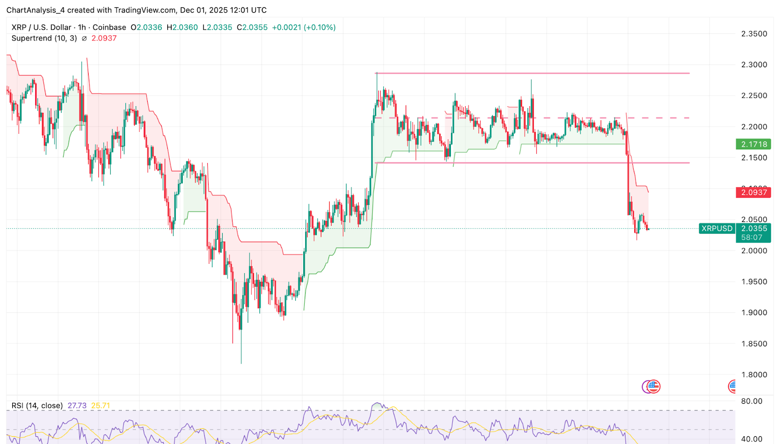 لا يزال Supertrend باللون الأحمر عند 2.09 دولار، مما يعزز الاتجاه الهبوطي على المدى القصير. يجلس RSI بالقرب من 27، مما يظهر ظروفًا غير مشبعة بالشراء ولكن لا يشير بعد إلى تعافي ذي مغزى. كل ارتداد خلال اليوم توقف بالقرب من نفس منطقة الرفض، مما يظهر أن البائعين يدافعون بقوة حتى في الأطر الزمنية الأدنى. ما لم تستعد XRP 2.09 دولار، فمن المحتمل أن تتلاشى المحاولات اليومية للتعافي.