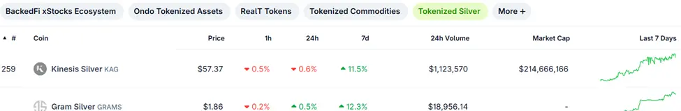 على الرغم من زخم سعر XAG، إلا أن قطاع الفضة المرمّز لا يزال غير متطور. فقط عدد قليل من المشاريع، Kinesis Silver (KAG) و Gram Silver (GRAMS) تظهر على المنصات الرئيسية للتتبع.