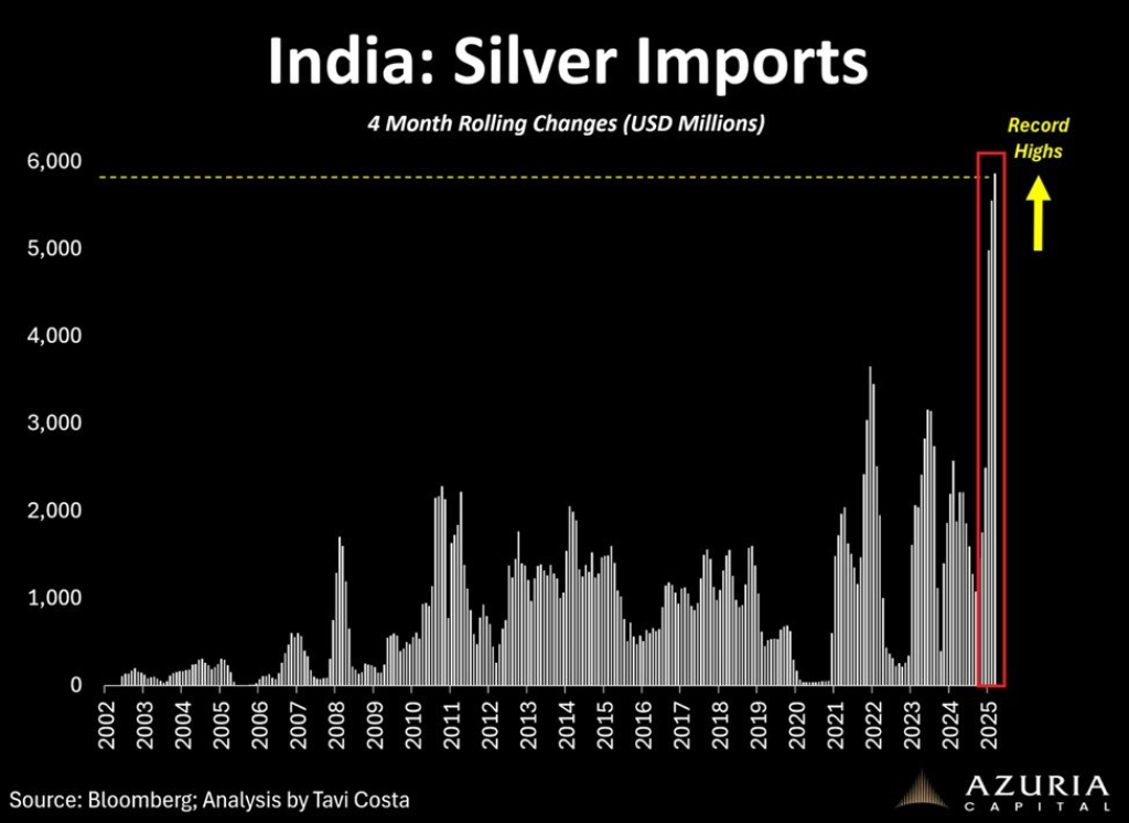 Um das ins Verhältnis zu setzen: Zwischen 2013 und 2019 importierte Indien durchschnittlich nur etwa 1,5 Milliarden US-Dollar Silber pro Jahr. Heute absorbiert es in nur wenigen Monaten fast das Vierfache davon.