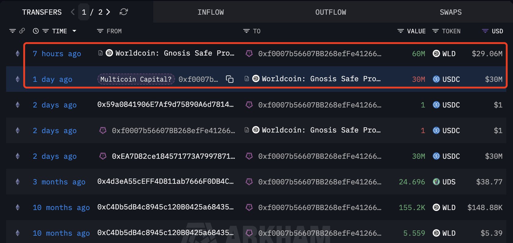 Los datos en cadena han añadido una capa adicional de confianza a la configuración actual de WLD. Según Lookonchain, el 25 de diciembre, una cartera (0xf000) vinculada a Multicoin Capital gastó $30 millones de USDC para adquirir 60 millones de WLD a un precio promedio de $0.50 mediante un acuerdo OTC.