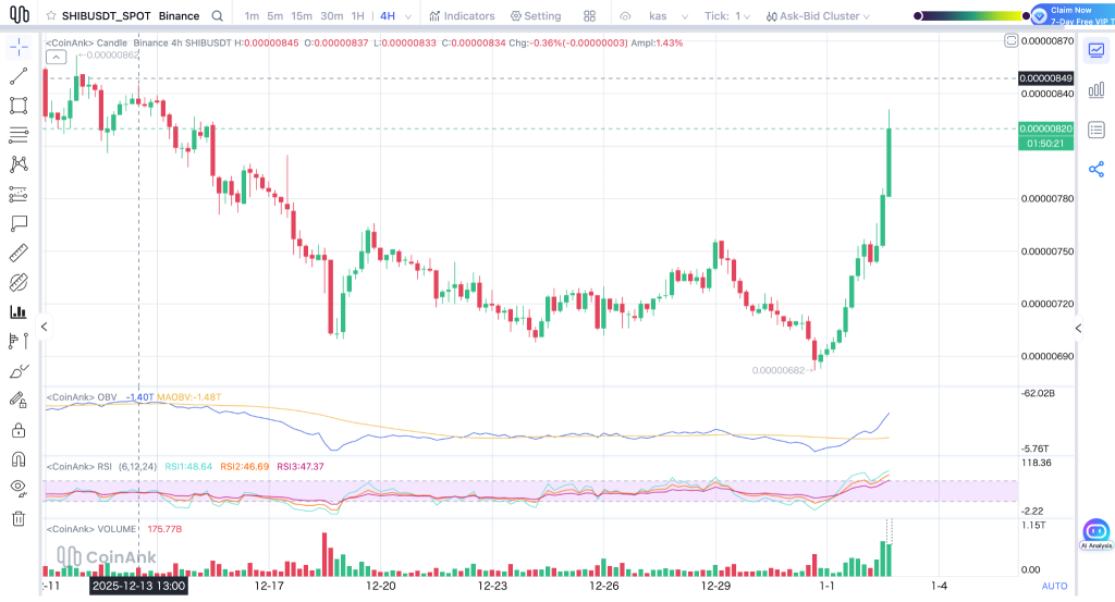 El gráfico de SHIB finalmente empieza a girar En el gráfico de 4 horas, el precio de SHIB pasó la mayor parte de diciembre estancado en una lenta caída. Los rallies se vendían rápidamente y el precio luchaba por ganar impulso. Eso empezó a cambiar una vez que SHIB mantuvo la zona de $0.00000680 y comenzó a formar mínimos más altos. El último impulso llevó el precio a atravesar la resistencia alrededor de $0.00000780–$0.00000800, seguido por una vela de expansión fuerte que probó brevemente la zona de $0.00000820.