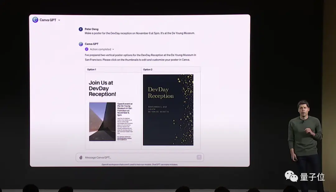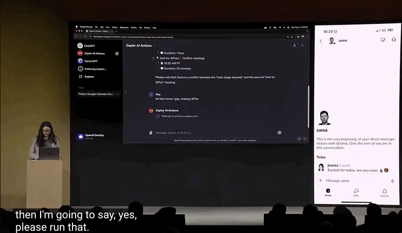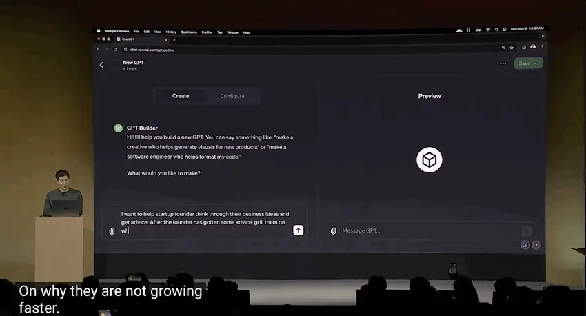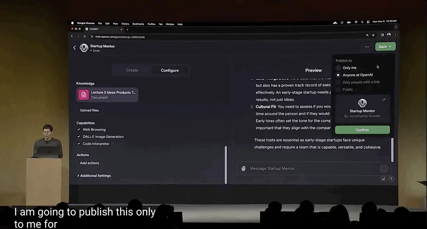 El CEO Sam Altman subió al escenario para demostrar en el acto, en menos de 3 minutos, y solo unos pocos pasos para hacer un buen trabajo de “mentor emprendedor GPT”.