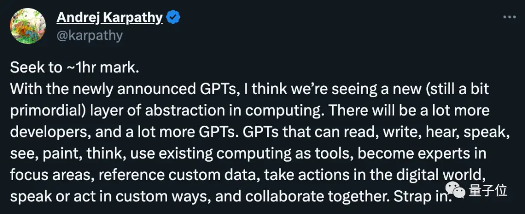 Habrá más desarrolladores y más GPT. GPT puede leer, escribir, escuchar, hablar, ver, dibujar, pensar, utilizar la informática existente como herramienta, convertirse en un experto en áreas clave, consultar datos personalizados, actuar en el mundo digital, hablar o actuar de forma personalizada y colaborar juntos. Abróchate el cinturón.