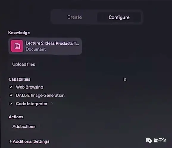 Al mismo tiempo, los usuarios pueden controlar si el GPT construido puede acceder a Internet, si tiene la capacidad de generar imágenes y código, y cargar documentos de conocimiento para fortalecer las capacidades profesionales.