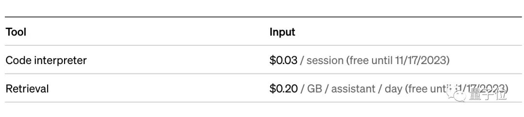 En el lado de la API de asistentes, el intérprete de código cobra tres centavos por sesión. Las búsquedas se cobran en función de la capacidad y los días.