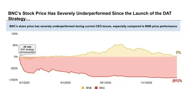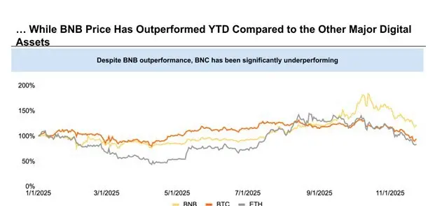 Las acciones de BNC cayeron un 90% a pesar de tener $428 millones en tokens BNB, creando un gran descuento sobre el NAV.