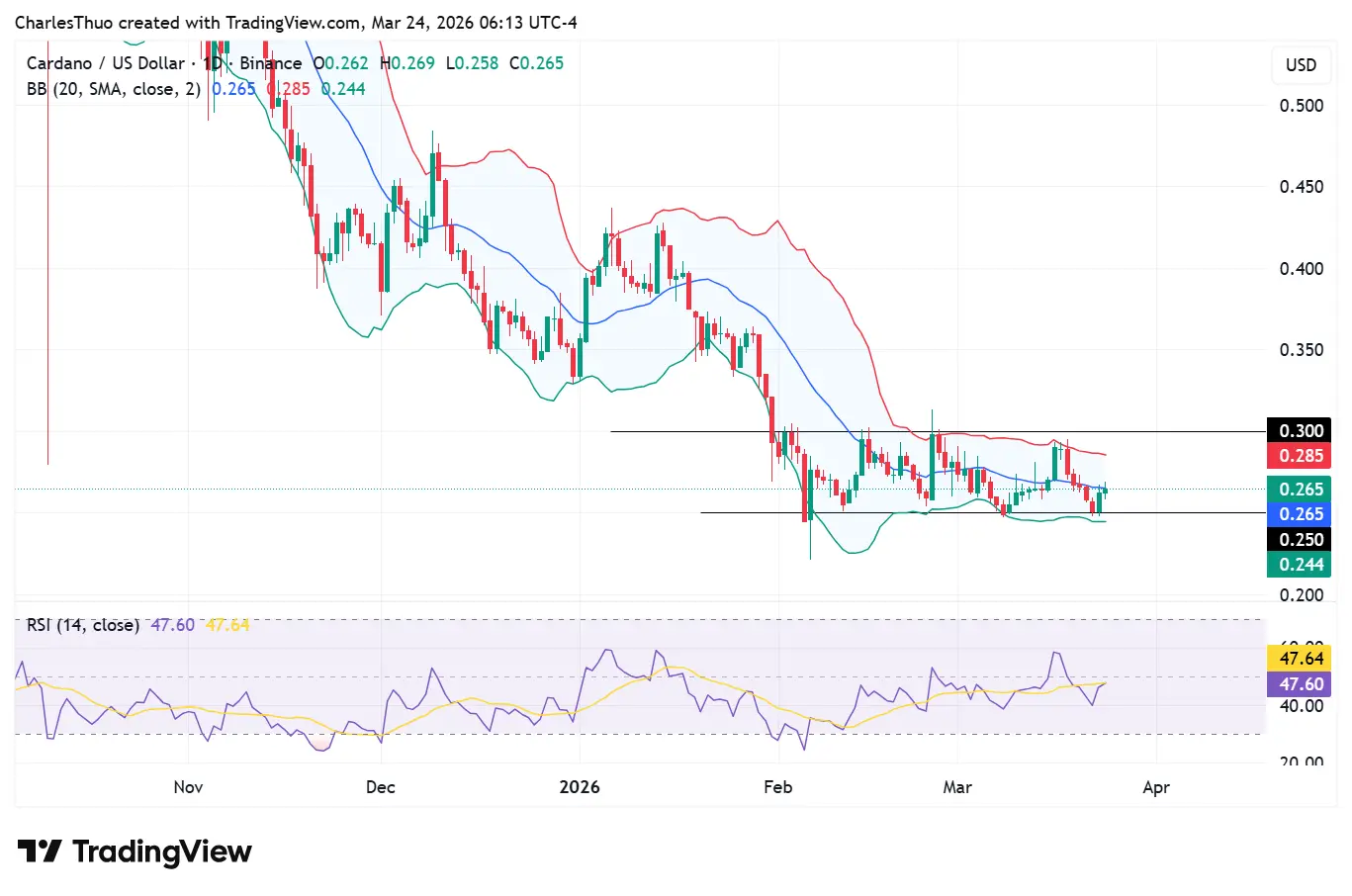 En los gráficos, ADA se está consolidando entre $0.24 y $0.29, formando un rango que destaca tanto el interés de los compradores como la presión de venta persistente.
