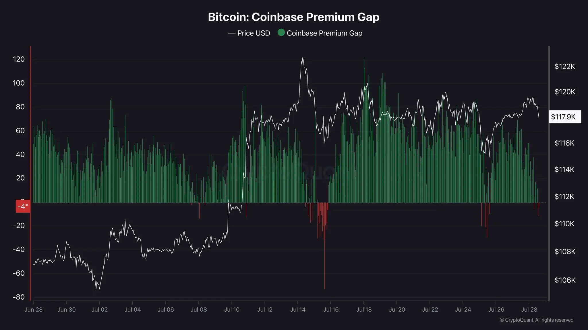 Selon les données de CryptoQuant, après une période de maintien actif, le Premium de Coinbase est devenu négatif à la fin juillet – un signal à prendre particulièrement en compte.