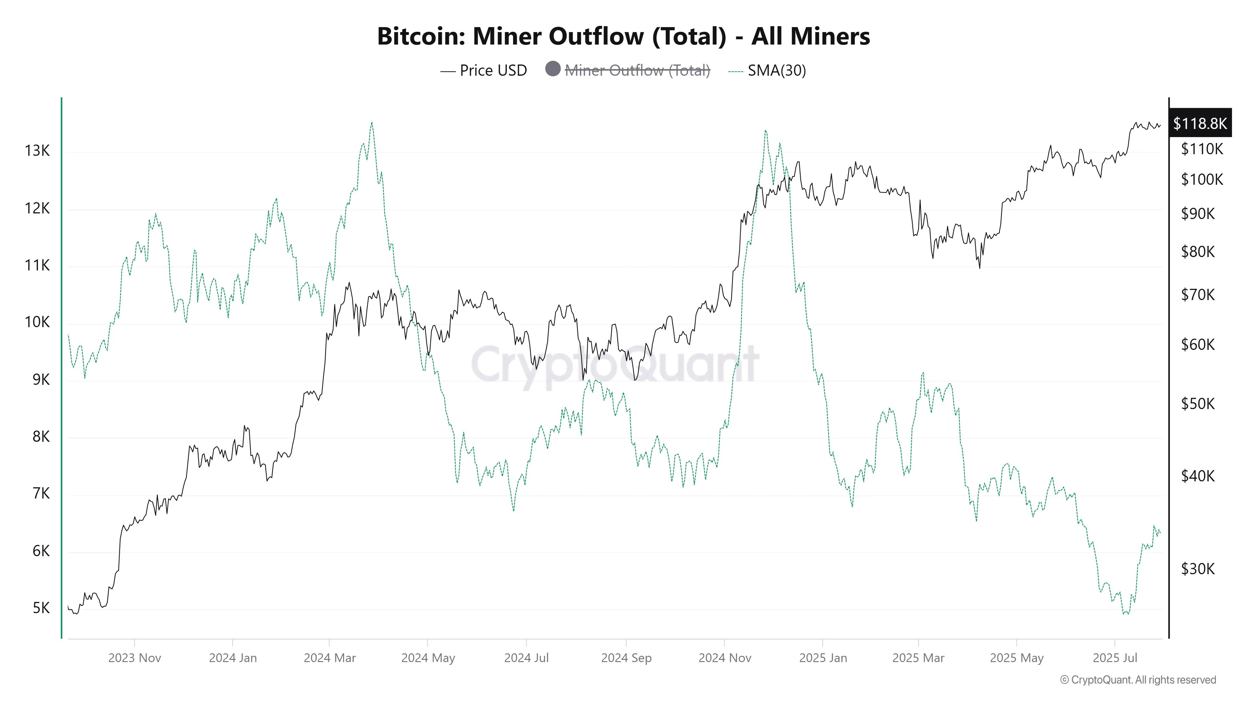 Les données de CryptoQuant montrent qu’au cours du mois de juillet, le flux de BTC quittant les portefeuilles des mineurs a commencé à augmenter à nouveau après une période de baisse précédente, indiquant une possibilité de retournement de tendance.