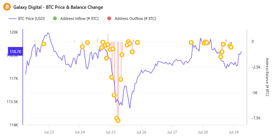 Le prix du Bitcoin et l’activité des flux de fonds entrants/sortants du portefeuille Galaxy Digital | Source : CryptoQuantLes données de CryptoQuant montrent que les retraits massifs du portefeuille géré par Galaxy Digital coïncident souvent avec les phases de correction du prix du Bitcoin.