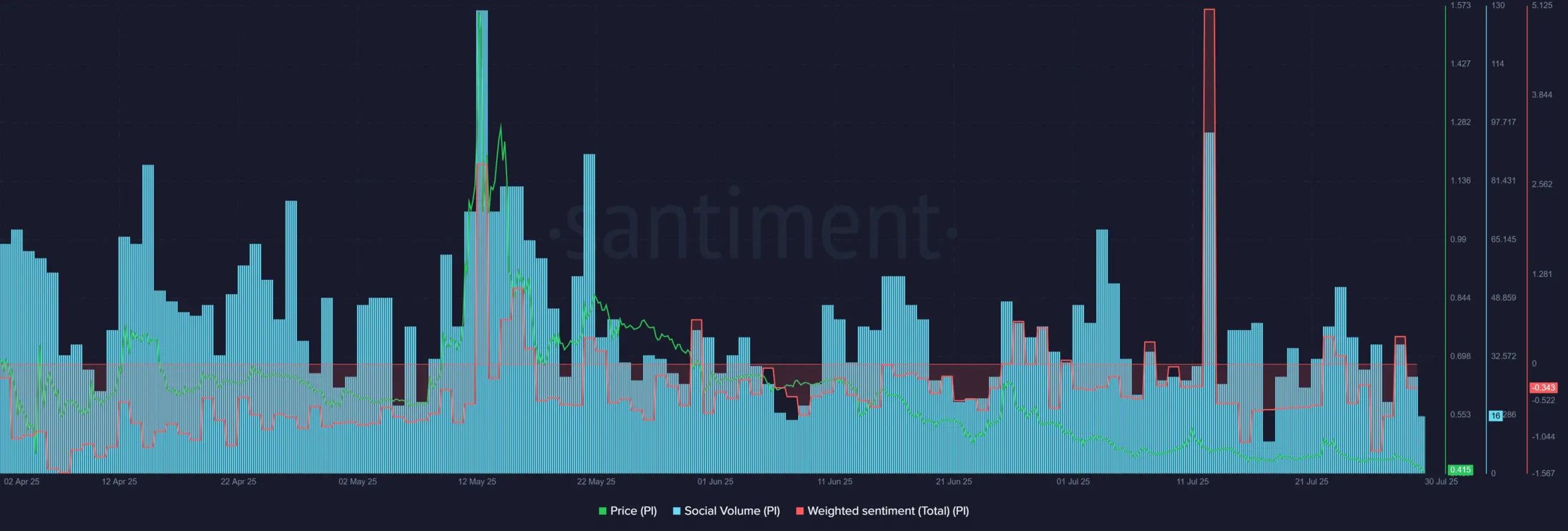 Depuis le sommet de mai, le volume des discussions sur Pi sur les réseaux sociaux ainsi que le niveau d’intérêt du marché ont continuellement diminué. L’effort pour briser la tendance baissière à la mi-juillet n’a pas réussi, empêchant cette pièce de créer un nouveau mouvement de prix.