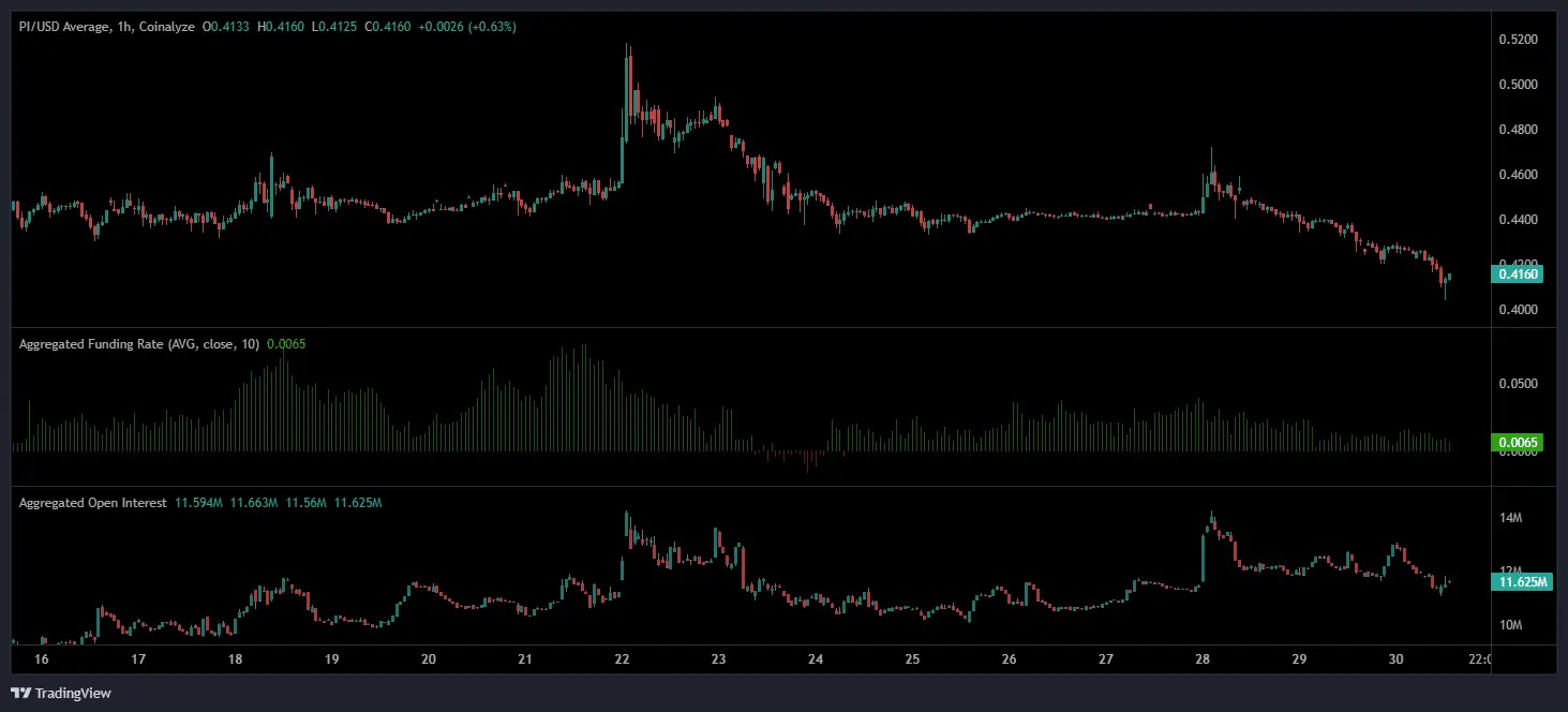 Source : SantimentSur le marché des dérivés, les données de Coinalyze montrent également que le contrat ouvert (OI) a chuté de près de 17 millions USD à moins de 12 millions USD depuis la fin mai. En même temps, le taux de financement reste bas, indiquant que la demande de trading à effet de levier avec Pi est dans un état faible.