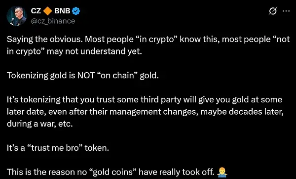 C'est une différence subtile mais essentielle, où le BTC crée la confiance entièrement à partir de 0, tandis que l'or tokenisé numérise la structure de confiance traditionnelle, comme l'a récemment déclaré CZ dans un tweet :