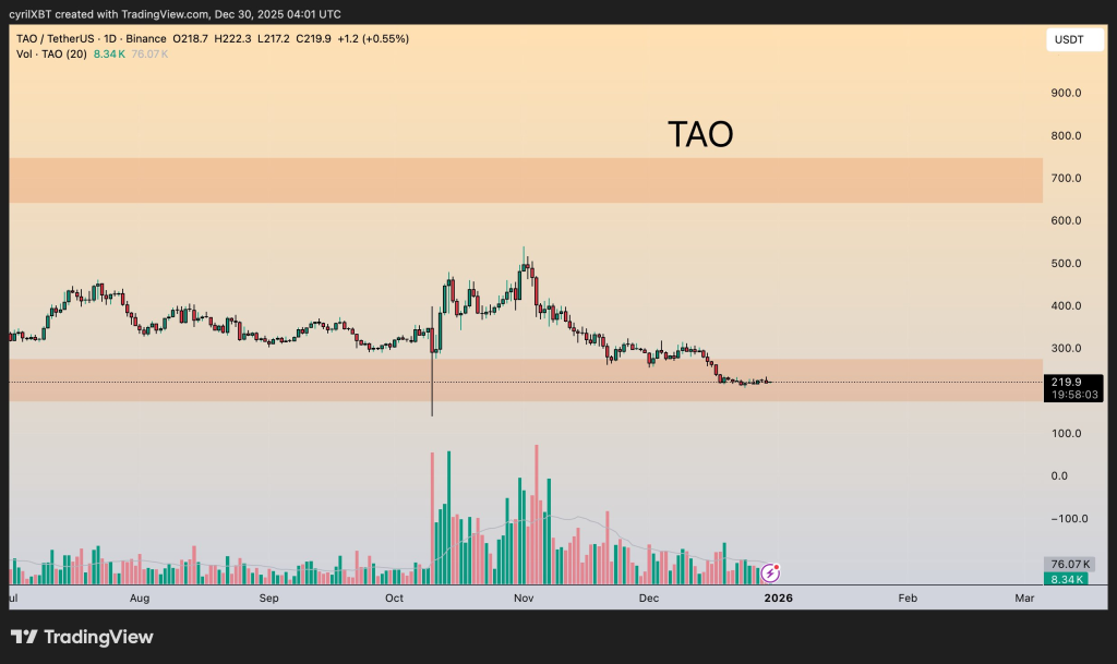 Pour l’instant, le graphique indique essentiellement ceci : le marché a cessé de payer des prix premiums pour le TAO, et il teste si cette fourchette inférieure peut tenir sans une nouvelle vague de vente.