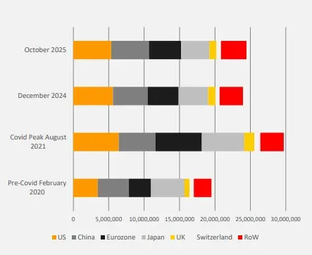 Le graphique montre l’évolution du bilan de la banque centrale des grandes économies de février 2020 (avant la pandémie de COVID-19) jusqu’en octobre 2025, illustrant les phases de relâchement et de resserrement quantitatif | Image : Indices de liquidité globale### Vue d’ensemble