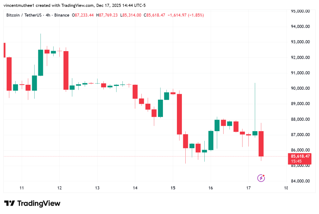 Chart 4 jam Bitcoin di TradingView menunjukkan seberapa cepat Bitcoin naik di atas $90.000 sebelum kembali turun tajam ke $85.618 pada 17 Desember. Permainan likuiditas telah ditandai sebagai alasan utama di balik pergerakan harga ini, karena pemilik posisi short dan long keduanya mendapatkan hukuman.