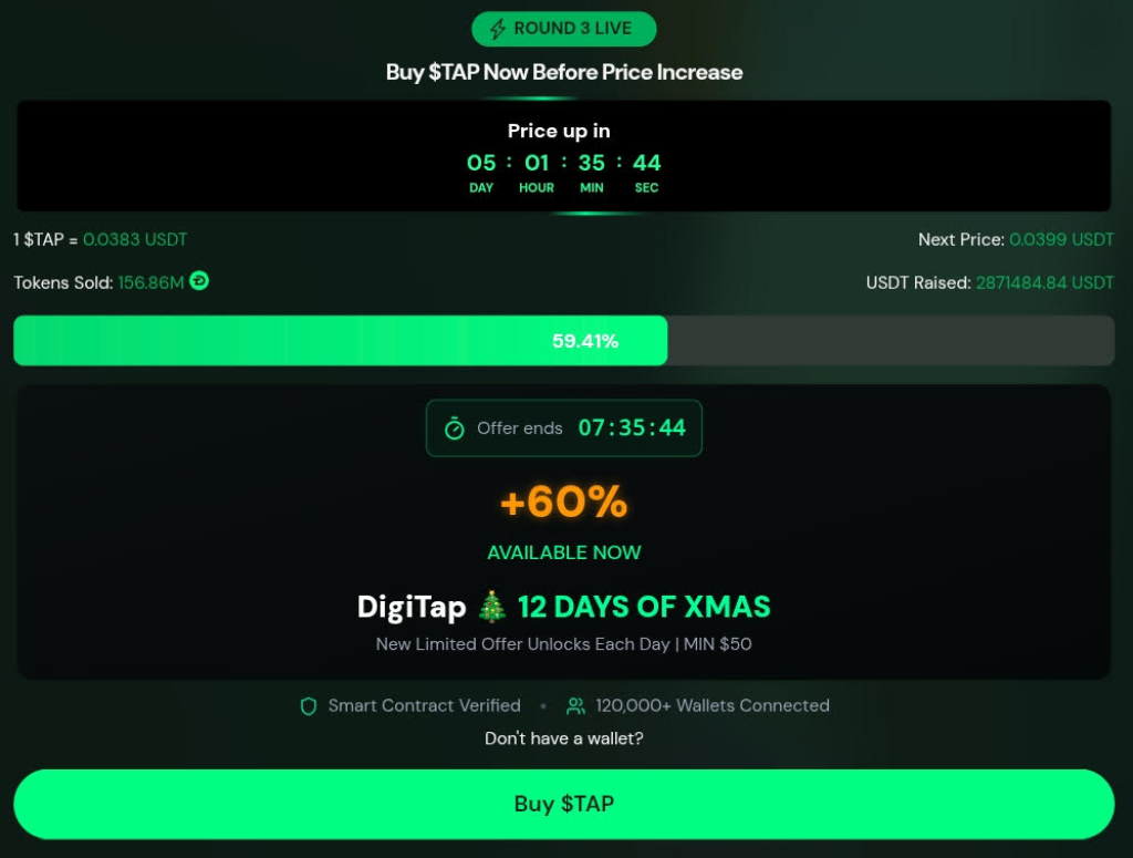 Sementara kapital besar berhenti, uang pintar beralih ke crypto presale Digitap karena fokusnya pada utilitas keuangan. Paus sekarang berinvestasi penuh di presale Digitap selama musim Natal ini karena adopsi global menempatkan Digitap sebagai potensi altcoin 10x saat bull kembali di 2026.