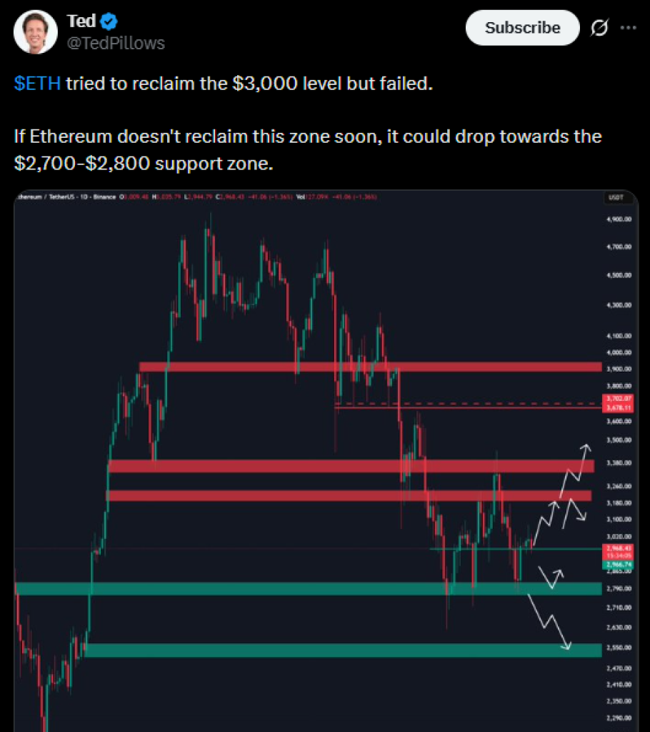 Analis pasar juga tidak terlalu optimis tentang raja altcoin ini. Menurut analis TedPillows, penolakan Ethereum di $3.000 menempatkan zona $2.700–$2.800 kembali dalam pandangan jika pembeli tidak segera masuk.