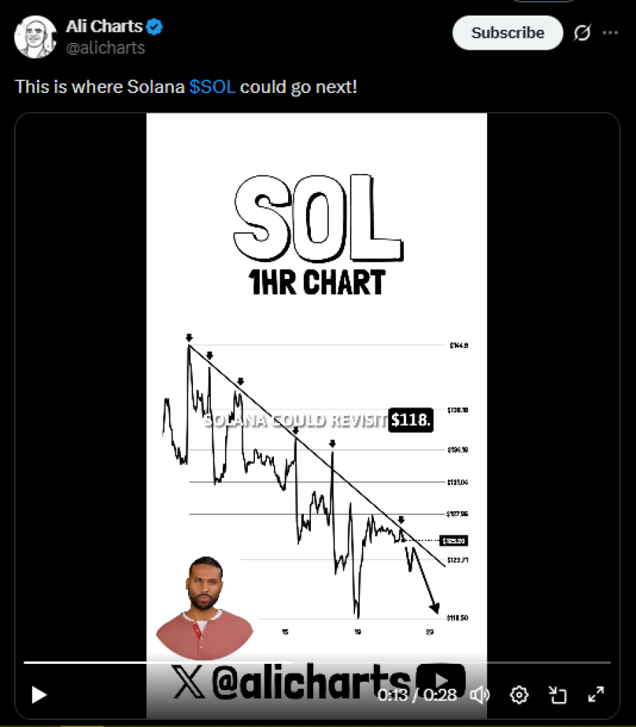 Analis Ali Martinez juga mencatat bahwa Solana telah ditolak beberapa kali oleh garis resistance yang telah ada sejak Oktober. Dan kegagalan lain bisa menarik harga kembali ke $118. Tapi analis ini percaya masih ada peluang. Menurut Ali, hanya dengan break bersih di atas $128 , jalur menuju $135 akan terbuka kembali.