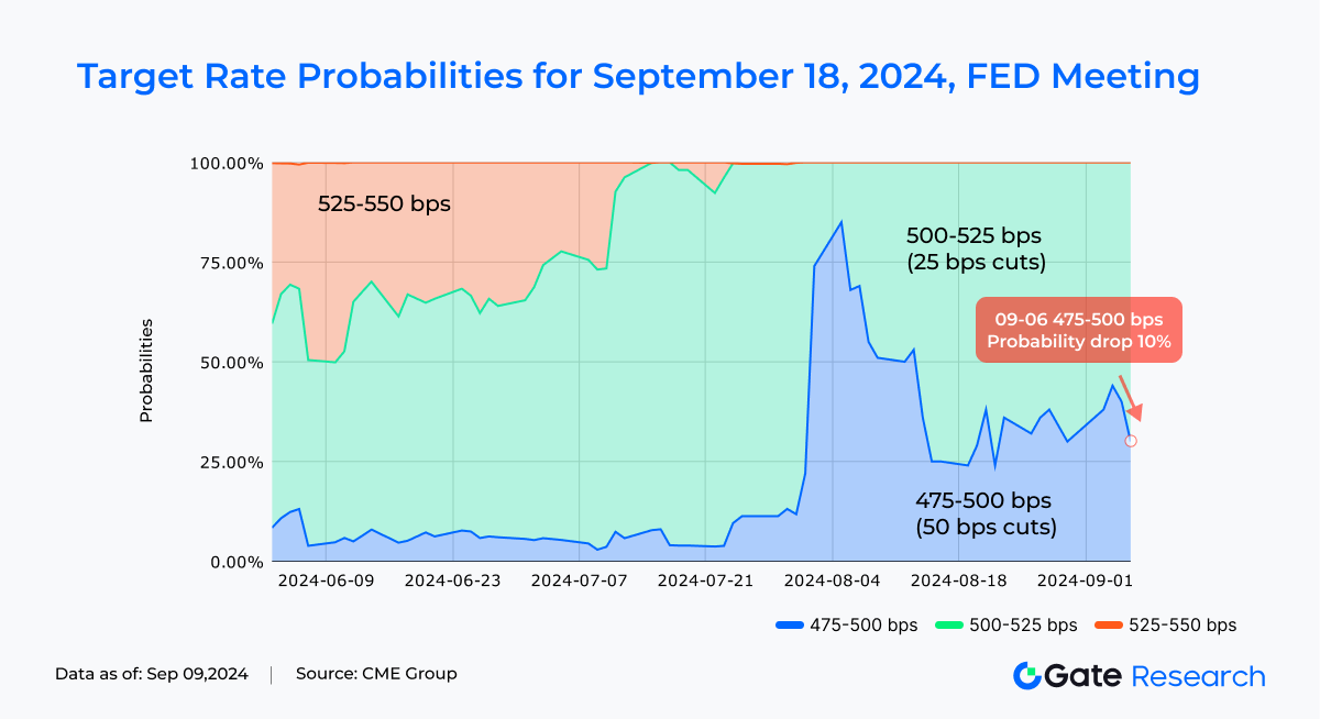 Kemungkinan penurunan suku bunga 50 poin dasar tidak meningkat, tetapi malah menurun karena tiga alasan: Meskipun data non-pertanian Agustus sedikit di bawah ekspektasi, tetapi masih berada dalam kisaran yang wajar dan tidak menunjukkan resesi yang serius. Dibandingkan dengan bulan Juli, jumlah pekerja non-pertanian meningkat sekitar 50 ribu, tingkat pengangguran turun menjadi 4,2%, untuk pertama kalinya dalam setengah tahun, menunjukkan pemulihan pasar tenaga kerja. Pada saat yang sama, kenaikan gaji melebihi inflasi, permintaan konsumen stabil, menunjukkan bahwa ekonomi AS masih memiliki ketahanan. Oleh karena itu, secara umum pasar percaya bahwa tidak terlalu diperlukan untuk menurunkan suku bunga.