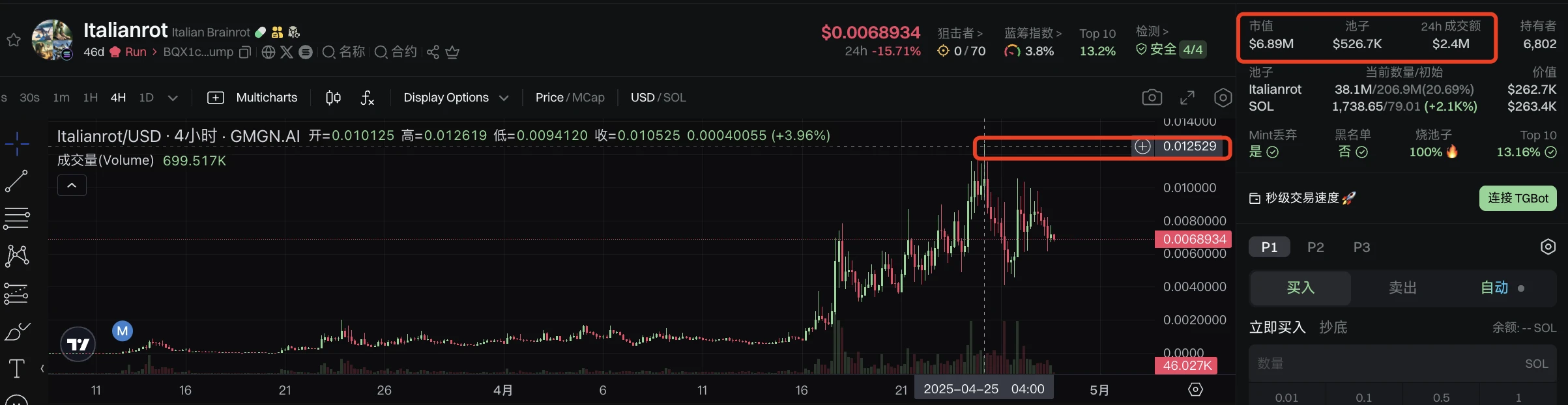 Italianrot コレクションを主打コンセプトとし、契約は今年の3月初めに最初に上場され、ある程度の OG 属性と正統性を持っています。これは以前のジブリスタイルに関連する Meme コインである Ghibli の位置付けに似ており、そのため時価総額は一時 1200 万ドルを超える高値に達しましたが、現在は戻っています。GMGN のデータによると、このトークンの現在の情報は以下の通りです: