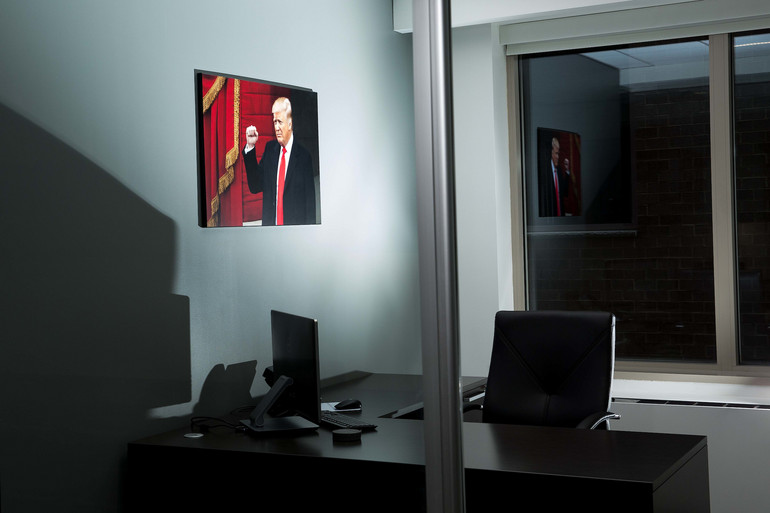 トランプが就任日の日に撮影した写真が、ブライアン・バラードの新設されたワシントンD.C.オフィスの壁に掛けられています。この写真はPOLITICOの写真家M.スコット・マハスキーによって2018年3月13日に彼のオフィスで撮影されました。