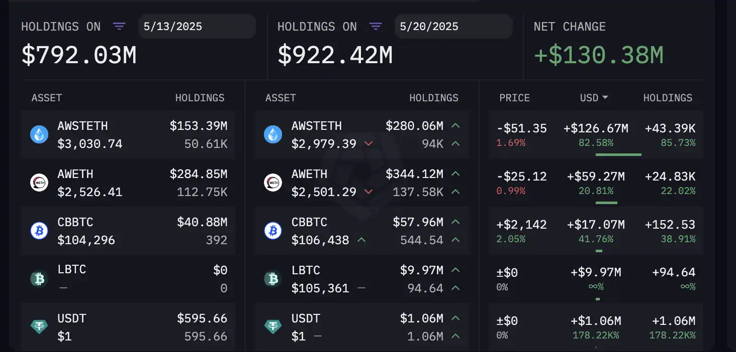 資本成長のペースに関しては、2025年2月中旬以降、同機関の資産は大幅に加速し、最近では10億ドルを超えました。 先週(5月13日から20日)だけでも、その純資産は1億3,000万ドル以上増加しましたが、これは主にAwSTETH(Aave v3 wstETH)ポジションの大幅な増加によるもので、1億2,000万ドル以上増加しました。