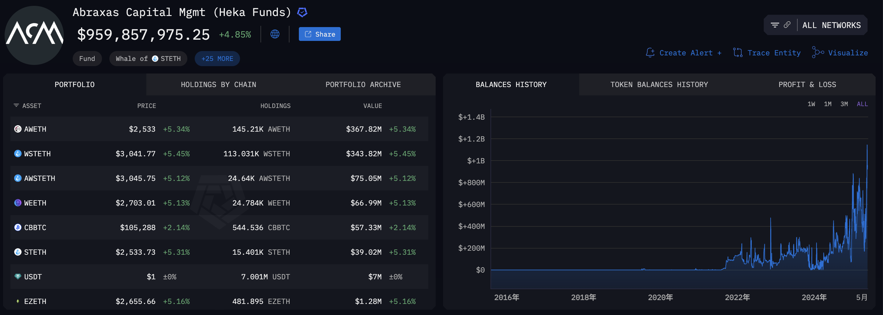 Arkhamのデータによると、5月20日現在、Abraxas Capitalの関連する2つの公開アドレスが保有する暗号資産の総価値は11.5億ドルを超え、累計利益は約2.8億ドルに達しています。