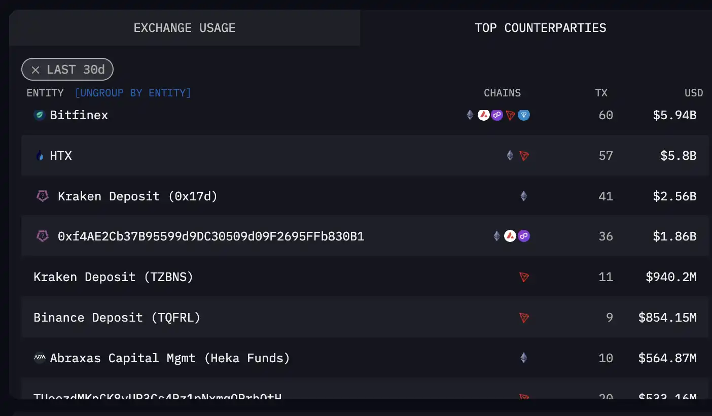 継続的な取引と協力により、Heka Fundsは徐々にTetherの最大の機関投資家の1つに成長し、Heka FundsはTetherの急速な発展の原動力とも言えます。 2021年にProtosが発表した調査レポートによると、Heka Fundsは当時、15億ドル以上のUSDTを受け取っており、これはTetherの総発行額の約1.5%を占めています。 この年、Heka Fundsは約5,200万ドルの利益を上げ、親会社のAbraxasが稼いだ580万ドルをはるかに上回り、グループ内で最も成功したファンドの1つになりました。 アーカムのデータによると、過去30日間で、テザーの主要な取引相手の中で、Heka Fundsは5億6,400万ドルを取引し、8位にランクされています。