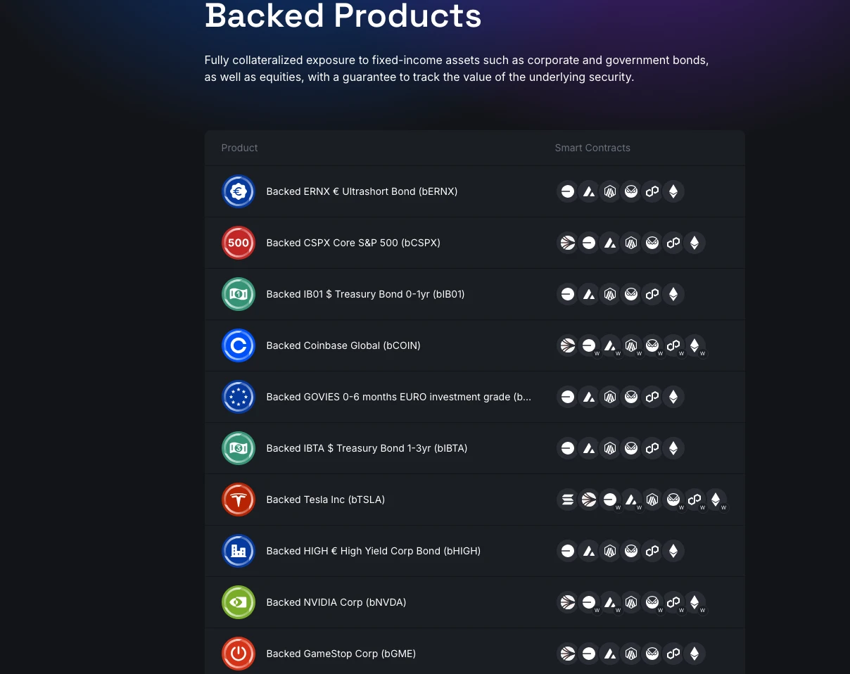 Backedはスイスの資産トークン化発行者で、主に株式とETFのトークン化に取り組んでいます。Backedはすでに多くのチェーン上でbCOIN、bCSPX、bTSLA、bNVDA、bMSTRなどの10種類の米国株トークンを発表していますが、Backed自体は米国株トークンの取引プラットフォームを提供しておらず、ユーザーはCoW swapや1inchなどのオンチェーンDEXを通じて、同社が発表した米国株トークンを直接取引できます。