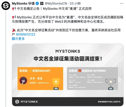 7月16日、MyStonksプラットフォームの「中文名全球徵集活動」が無事に終了し、公式にプラットフォームの中文名が「麥通」と発表されました。本イベントは、世界中のコミュニティメンバーからの活発な投稿と投票を引き寄せ、プラットフォームは合計で近千件のクリエイティブな提案を受け取りました。「麥通」はコミュニティメンバーの@DMW12123によって提出され、ブランドの意味に高度に一致することから最終的に採用賞を受賞し、888 USDTの報酬を得てコミュニティ大使に任命されました。同時に、5つのクリエイティブ賞はそれぞれ「邁市通」、「邁動」、「盛世通寶」、「巨石通」、「我的絲」の提案者に授与され、各自888 STONKSの報酬を得ました。